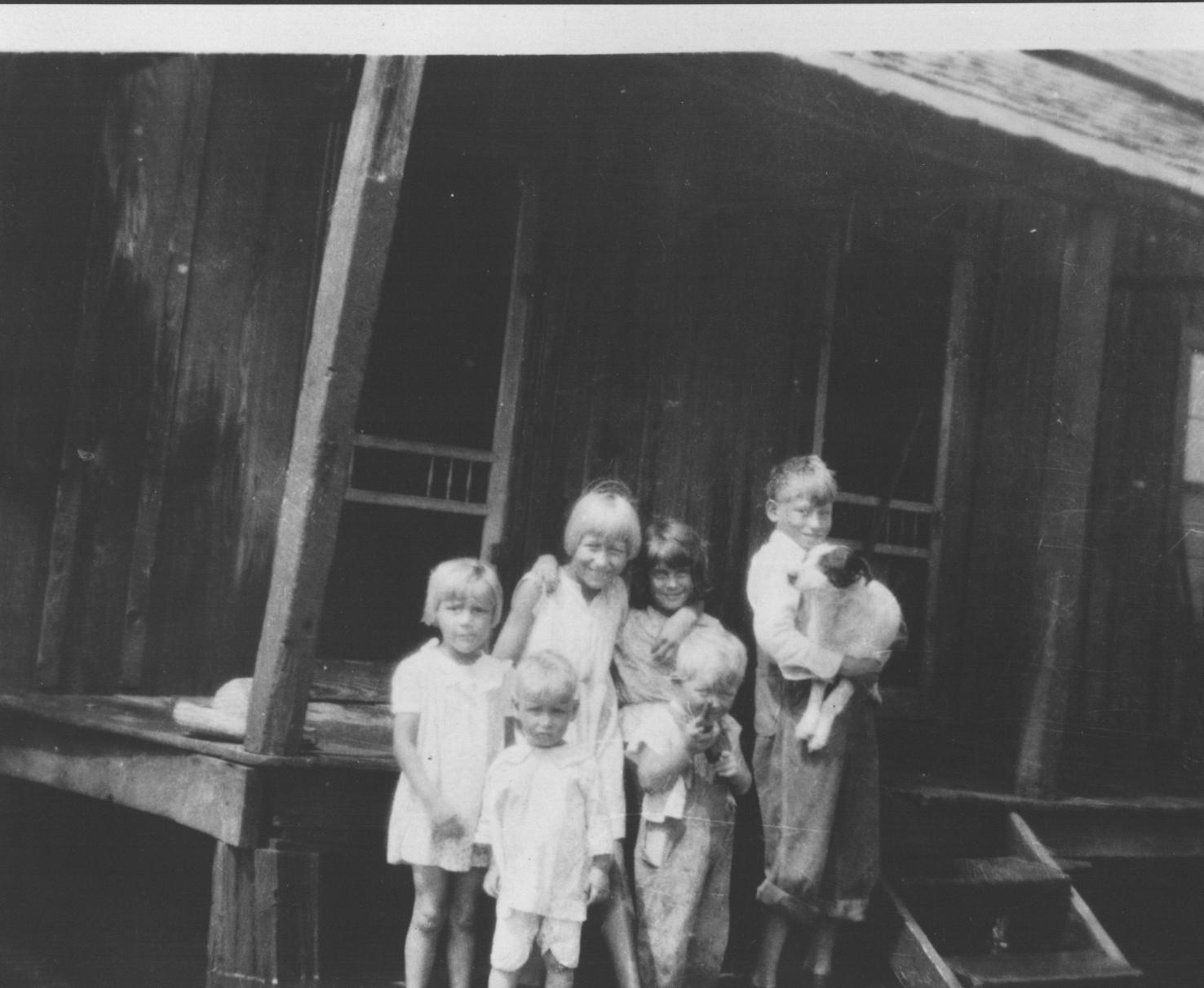 This is a picture taken at the James Samuel Bridges house at Two-mile island. I believe that the children shown are: Boys L-R: one of the little blond boys in Danial Bridges (correct spelling); the tall boy is his brother Leo Bridges. The other little boy must be a cousin. Girls L-R: Mary Ann Bridges, Ophelia Bridges, and a cousin (?) Mary Ann Bridges Stockton still lives in Kennett |