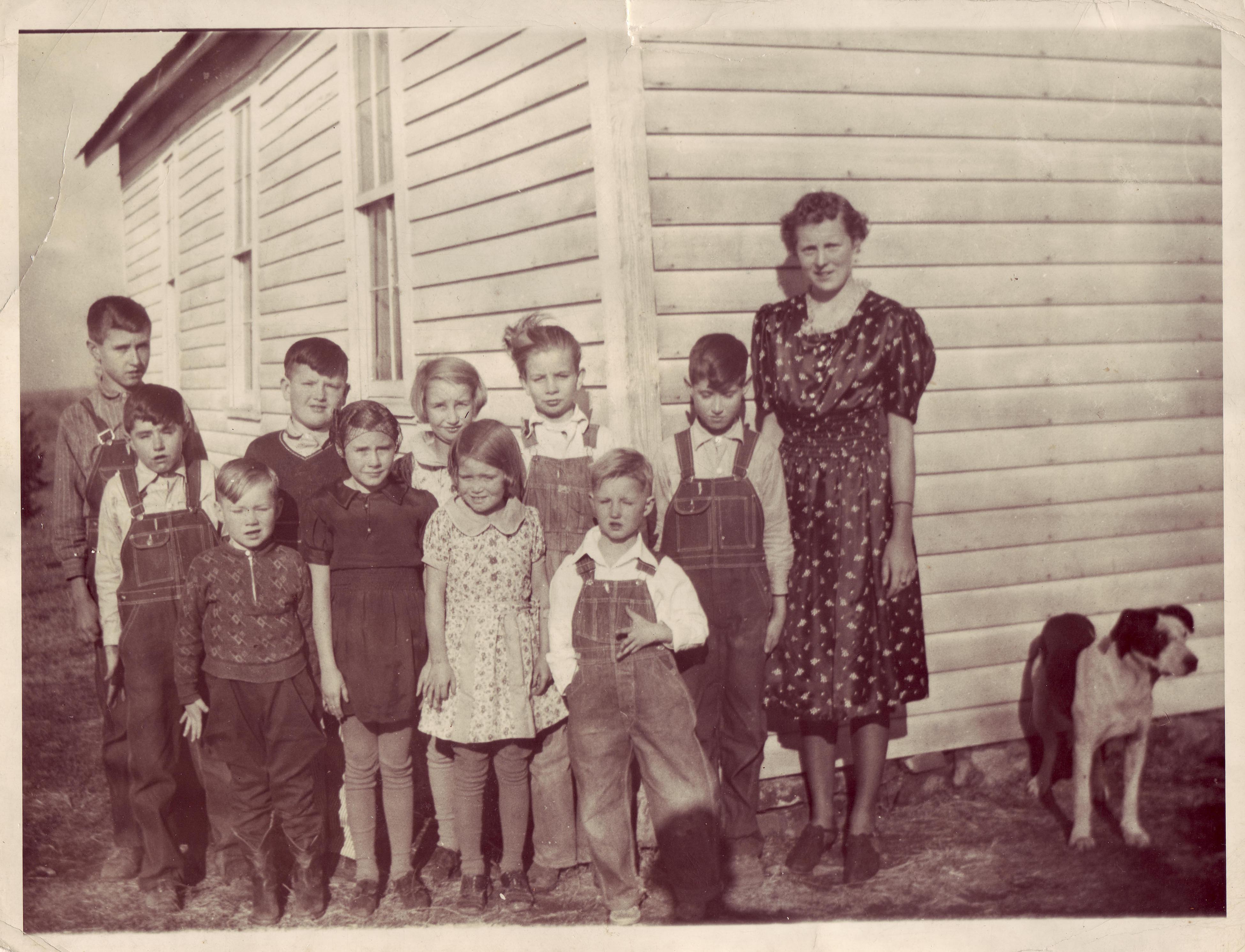Back row from left: John Frank DeHart, Raymond DeHart, Charles Roland Kincaid, Fern Quick, Eugene Quick, Audie DeHart and Florence Kelley McKinley, teacher.