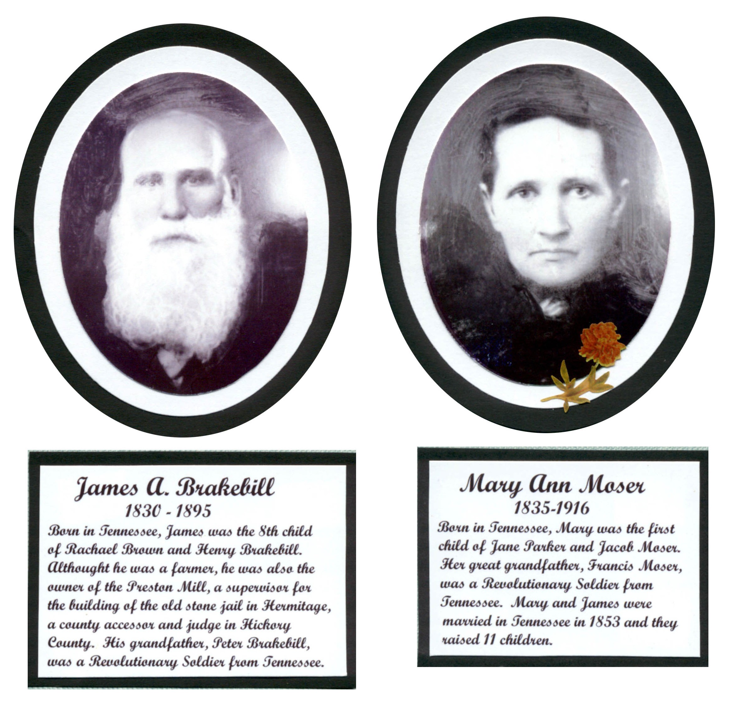 James A. Brakebill was born in Monroe county, Tenn., Mar. 2, 1830, and is now deceased. Mary A. Moser was born in the year 1835, in Monroe county, Tenn. James A. Brakebill and Mary A. Moser were married in Monroe county, Tenn., Jan. 16, 1853, by Lewis Carter.