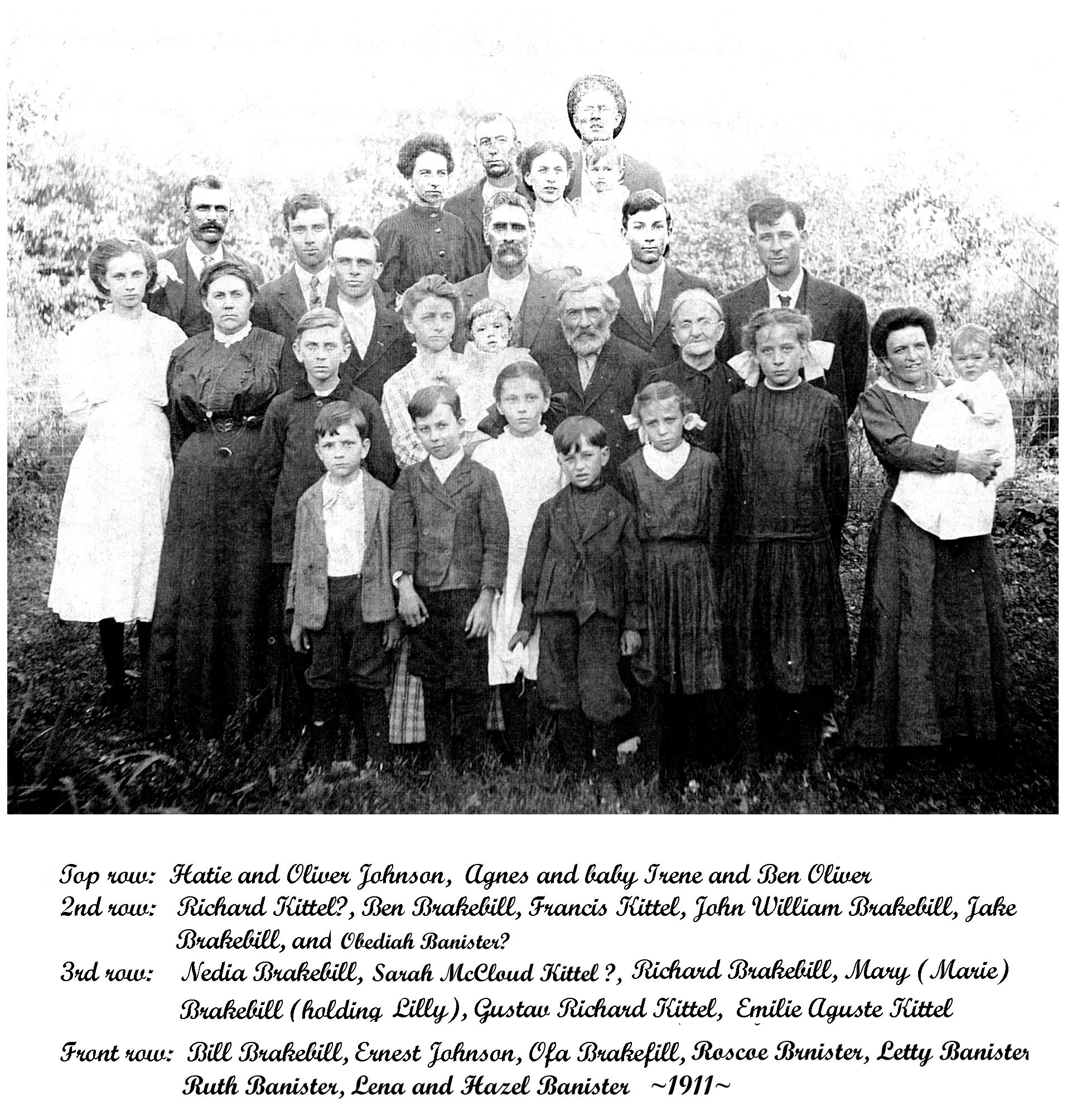 On March 7, 1888, John W. Brakebill married Marie Kittel, both of Cross Timbers, at the residence of W. M. Jenkins, Minister of the Gospel. A combined Kittel-Brakebill family photo is below.