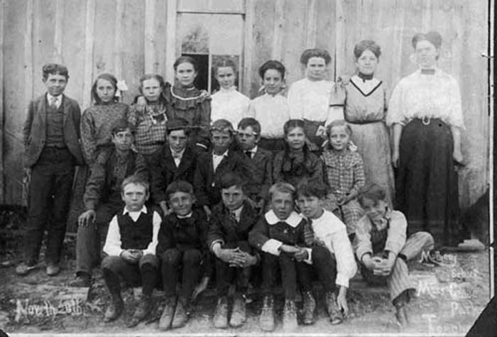 Back row: Willie Thomas, Ida Thomas, Gertie Brown, Sally Simpson, Grace Roark, Othello O'Bryan, Pearl Roark, Clara Thomas, Grace Parks, teacher.