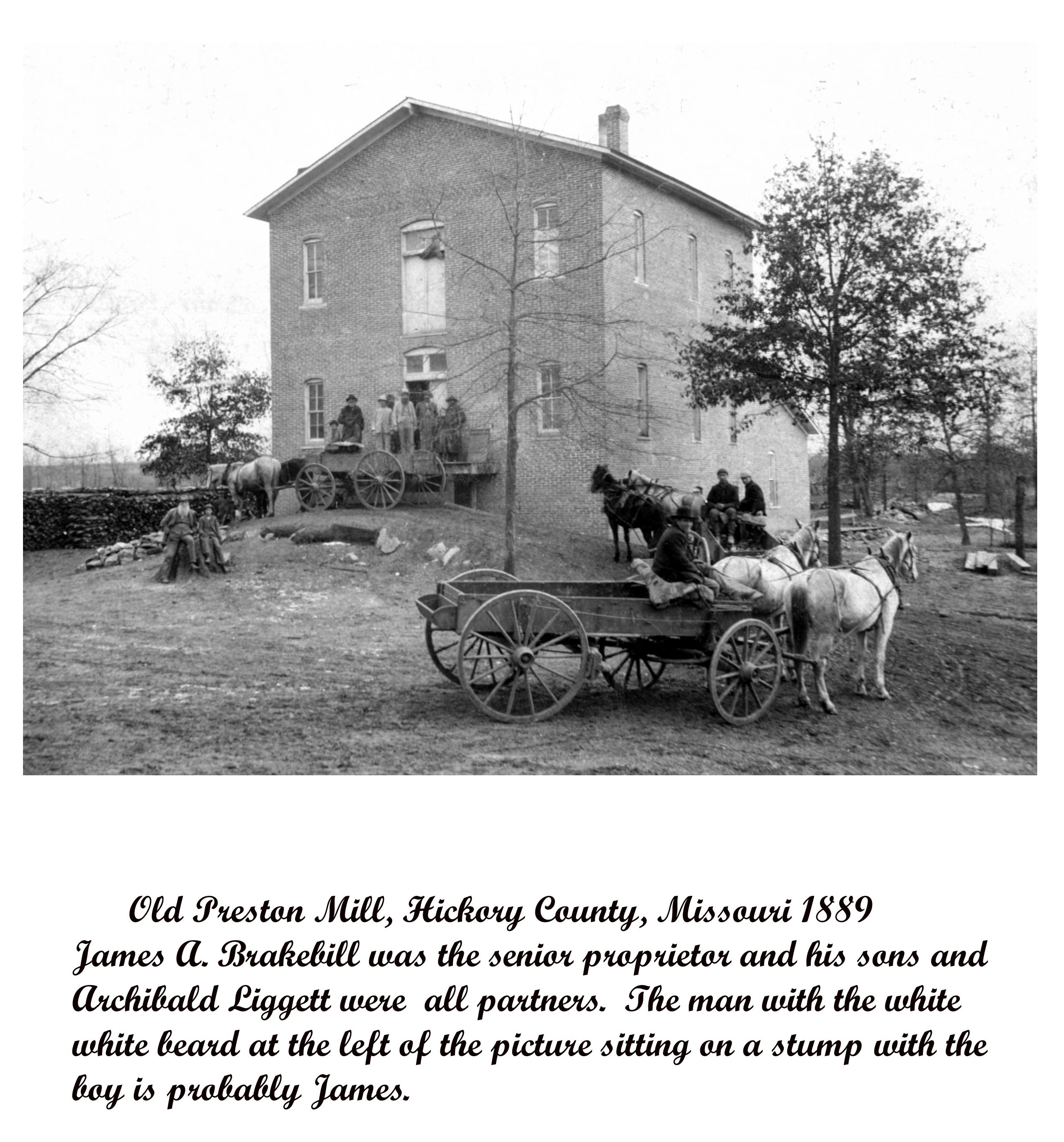 The old brick mill at Preston was built by the late James A. Brakebill, Sr., in 1889. It stands just south of Preston on a stream that was, of course, called Mill Creek. The bricks were made by Bill Campbell in a kiln that he built there for the purpose. John Niece of Humansville, Henry Niece of Cross Timbers, Aaron Darby of Pittsburg, and Bill Bonner of Urbana, who built the Buffalo Mill, were the carpenters who built it.