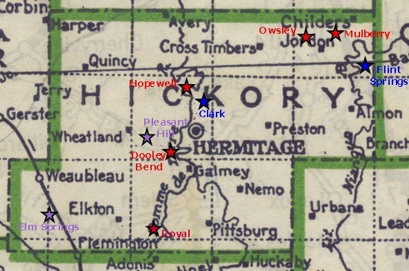 Clason's 1920 Guide Map of Hickory County is used as a base map for which to locate Hickory County schools which operated at various times from the late 1800s until consolidation occurred in the 1950s and later. Note that locations are approximate, due to the scale of the map. Schools will be added to this map as school and class photos are added to the photo page. Please email me if you have photos to add.