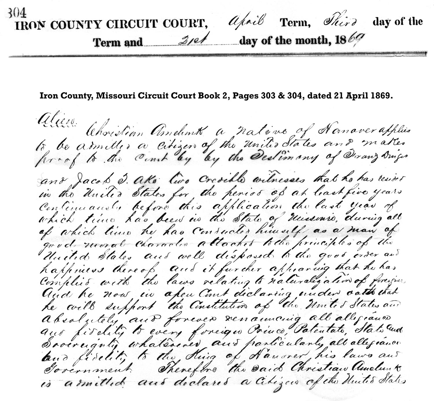 | Amelunk, Christian | Naturalization | 03 Apr 1869 | Iron | Christian Amelunk (aka Amelung) Naturalization. |