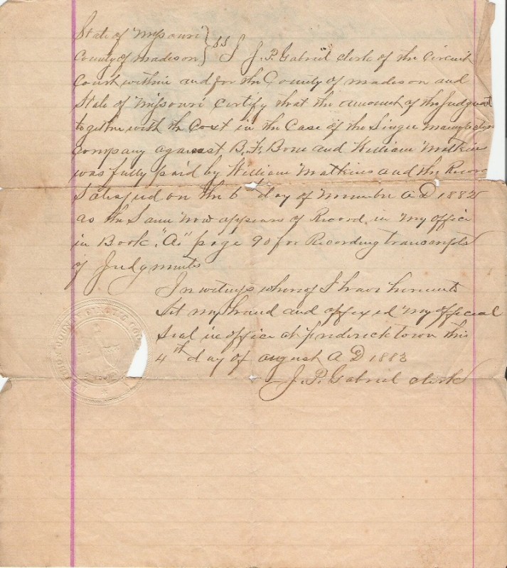 | Bone, B.F. | Letter | Aug 1883 | Madison | Singer Manufacturing against B. F. Bone and William Matkin. |