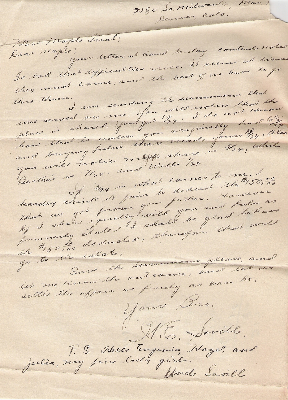 | Seville, W.E. | Letter | March | Iron | Letter to Mrs. Maple Tual from W. E. Seville. |