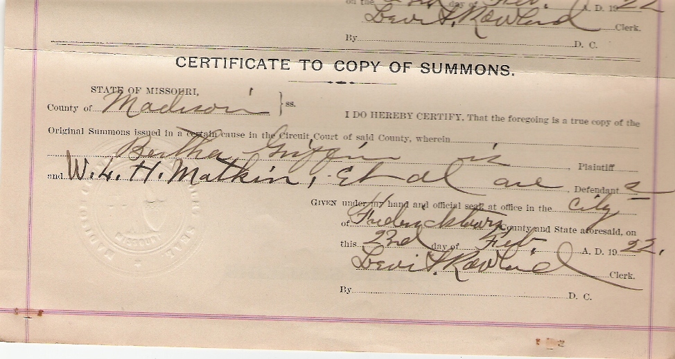 | Seville, Edgar | Court Document, summons 1, 2, 3 | 23 Feb 1922 | Madison | Bertha Griffin and Edgar Seville. |