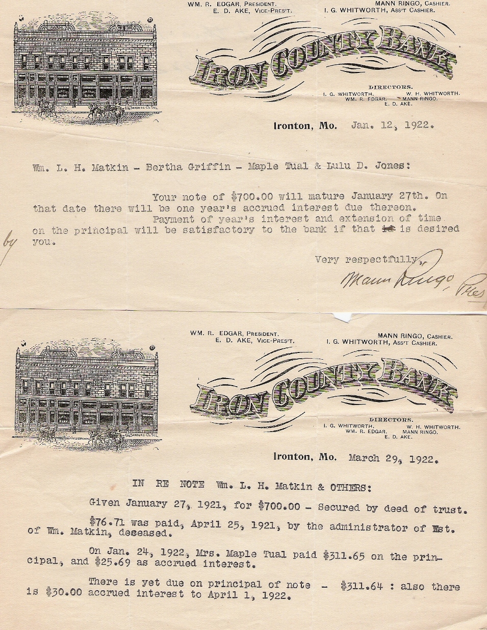 | Matkin, Wm. L.M. | Iron County Bank, notes | 12 Jan & 29 Mar 1922 | Iron | Wm. L. M. Matkin, Bertha Griffin, Maple Tual and Lulu D. Jones. |