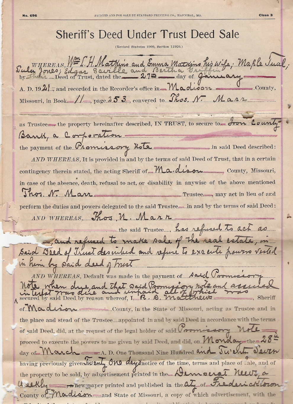 | Matkin, Wm. L.H. | Sheriffs Deed, 1, 2, 3, 4, 5 | May 1927 | Madison | R. D. Matthews conveying title of Wm. L. H. Matkin and others to Maple Tual. |