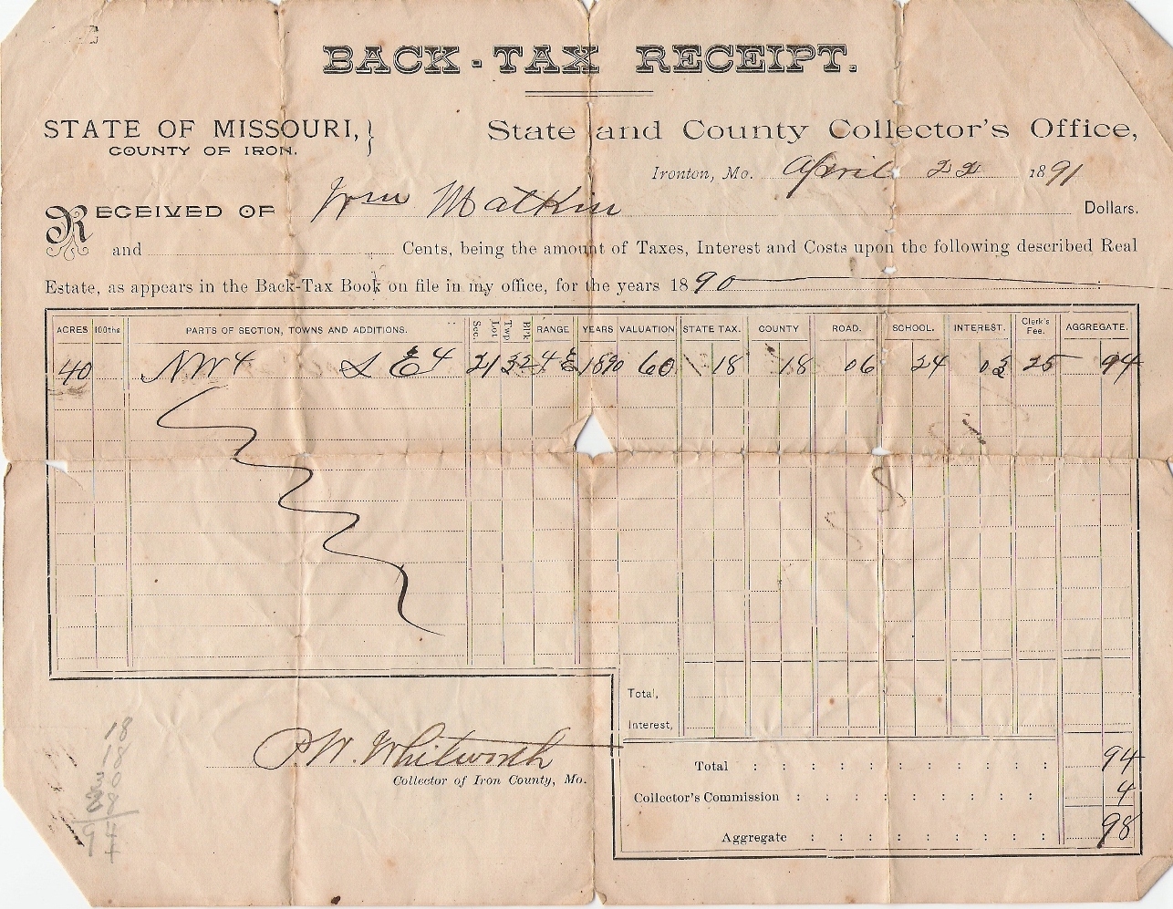 | Matkin, Wm. | Tax Receipt | 22 Apr 1891 | Iron | Wm. Matkin |