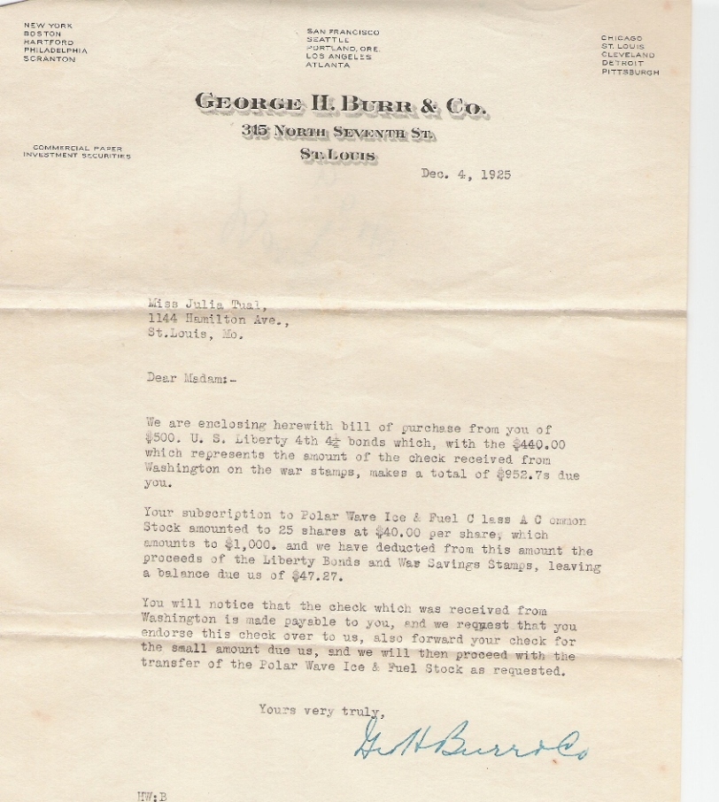 | Tual, Julia | Letter | 04 Dec 1925 | Julia Tual, purchase of bonds. | |