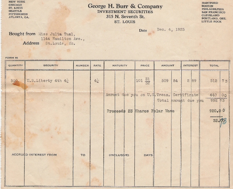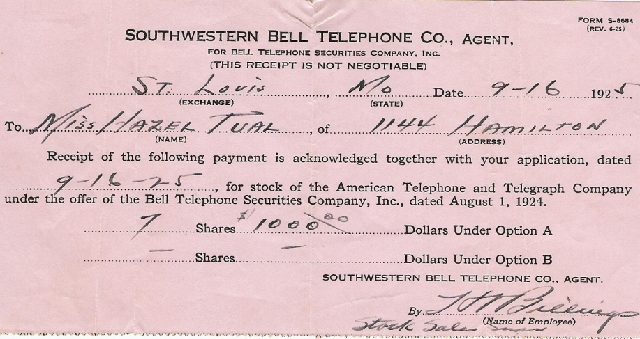 | Tual, Hazel | Stock Statement | 16 Sep 1925 | Hazel Tual, purchase of Southwestern Bell Stock. | |