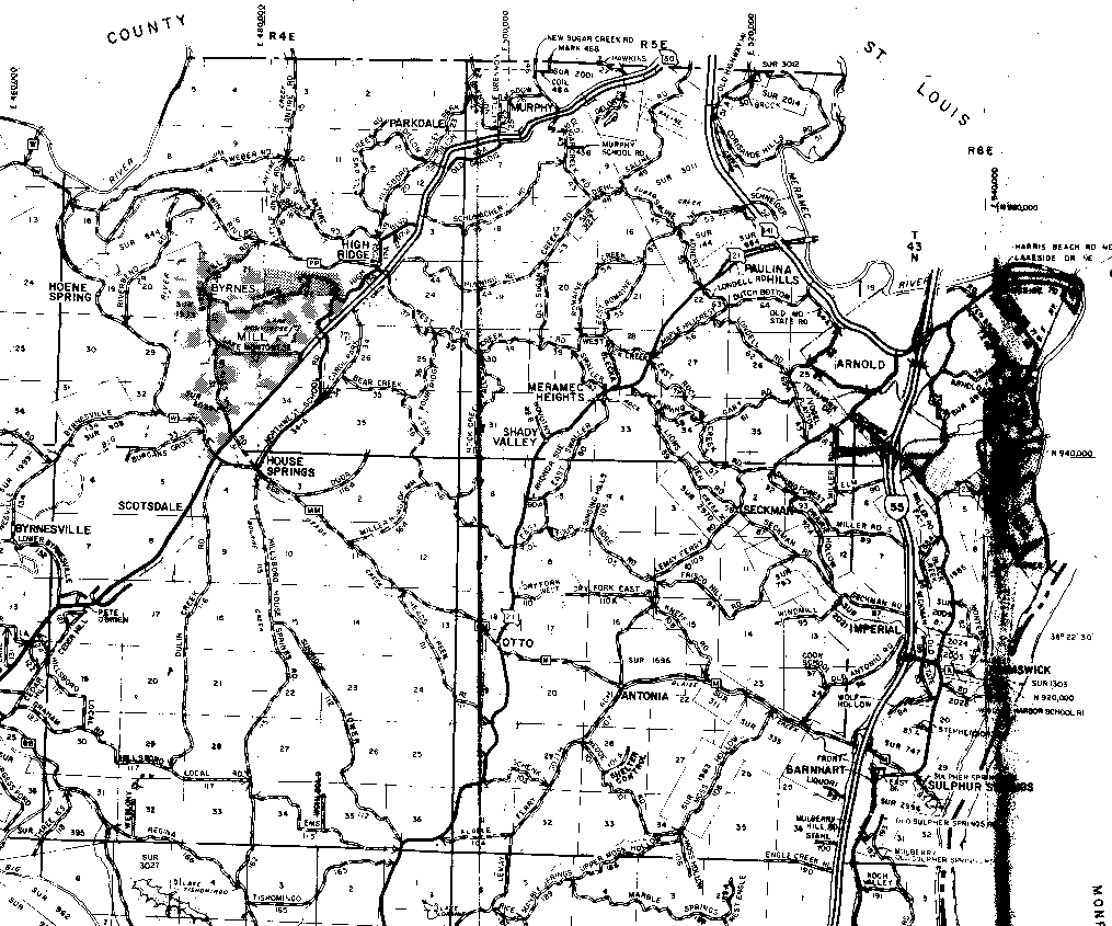 The western boundary of R4E is the vertical line that passes through the "O" and "P" of Hoene Spring, and the "S" of Byrnesville on the left side of the image. The Meramec River forms the eastern boundary of T43N,R6E and the northern part of the eastern boundary to T42N,R6E; the Mississippi River forms the southern part of the eastern boundary of T42N,R6E.