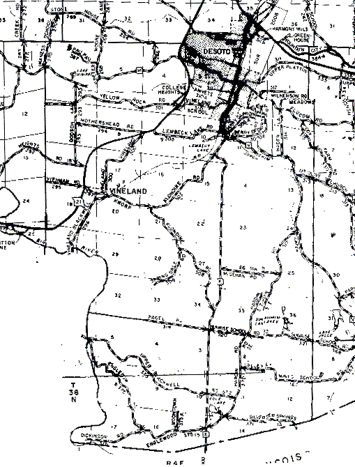 The northern boundary of T39N-R4E is the east-west solid line below the "dashed" line at the top of the image; it runs through the northern part of De Soto. The western boundary is the second north-south line from the left edge of the map. The eastern boundary is the first full-length north-south line from the right edge of the map. The southern boundary is the east-west (more or less) line just above the "T 38 N" that's printed near the bottom left of the map.