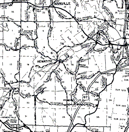 The township is slightly off-center toward the bottom of the image. Its northern, western, and southern boundaries are clearly indicated by the solid lines. The eastern boundary isn't visible due to all of th other information cluttering the right edge of the map. However, in the lower right corner it's possible to see the "36" indicating section 36, and the boundaries of section 35 to the east are clear. Above the middle of the right side, you can see the "Fe" of "Festus"; the eastern township boundary should run a little to the west of the highway that's just west of the "F".