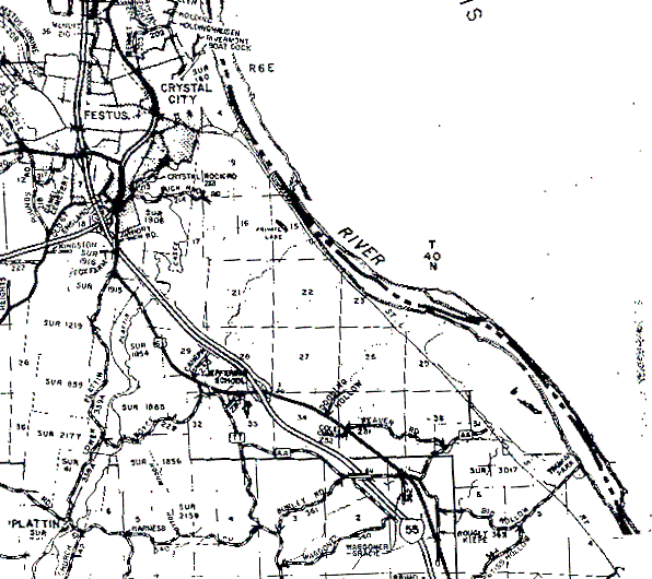 The boundaries of T40N,R6E are difficult to see, but many of the section numbers are clear, so it's fairly easy to work out where they should be. Section 36 has its northeast corner right on the Mississippi (or possibly out in its flood plain - that isn't clear from the map), toward the lower right corner of the map. The dark horizontal line at the bottom of section 36 is the township's southern boundary. If you follow the river upstream to the "R6E" on the map, the township's northern boundary should be just about there. The western boundary should be a (nonexistent) vertical line running just about due north from Plattin in the lower left corner of the map.