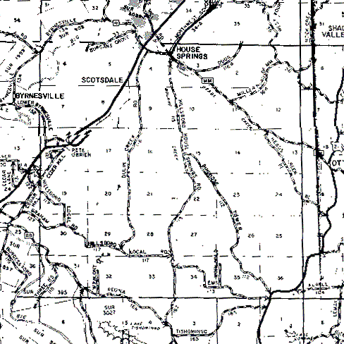 The township is centered in the image. The northern boundary is the dark line just north of House Springs. The western boundary is the first dark, vertical line from the map's left edge, and the southern boundary is the first dark, horizontal line from the bottom of the map. The eastern boundary is the dark, vertical line at the right side that runs the full height of the map. (The relatively wide, very dark, vertical line that ends in a point near the bottom of the map is the result of a crease in the paper map that was scanned.)