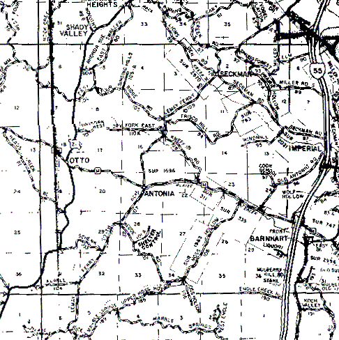 The northern, western and southern boundaries of T42N,R5E are the first dark, almost solid lines from their respective edges of the map. The eastern boundary is harder to find. If you look just to the right of the highway 55 "road sign", you will see the word "Elm"; the eastern boundary is the vertical line running through the "M".