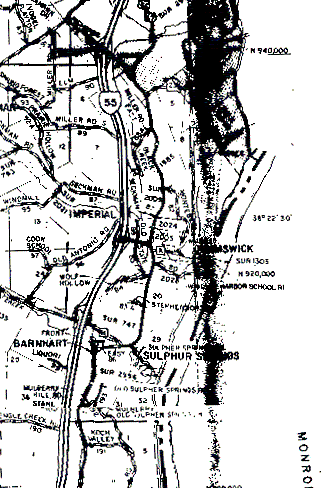 The western boundary of T42N, R6E is the vertical line that passes through the "M" of "Elm" toward the top middle of the map. The northern boundary is the horizontal line that crosses the vertical one just above "Elm". The southern boundary is the horizontal line just above "Koch Valley" near the bottom of the map. The eastern boundary is the Mississippi and Meramec rivers. The middle of the Mississippi is indicated by the heavy dashed line with thinner solid lines on each side of it. The Meramec is the wavy eastern edge of the big splotch on the upper right of the map.