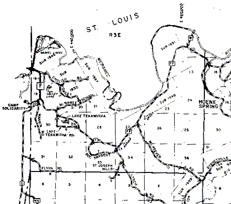 The southern boundary of the township is the darker, solid horizontal line near the bottom of the map (it passes just south of where "Flynn Rd" is written on the map). The eastern boundary is the solid vertical line passing through the "O" and "P" of "Hoene Spring", and the western boundary is the first vertical line near the map's left edge. The northern boundary is the Meamec River, with St Louis County on the north side of it.