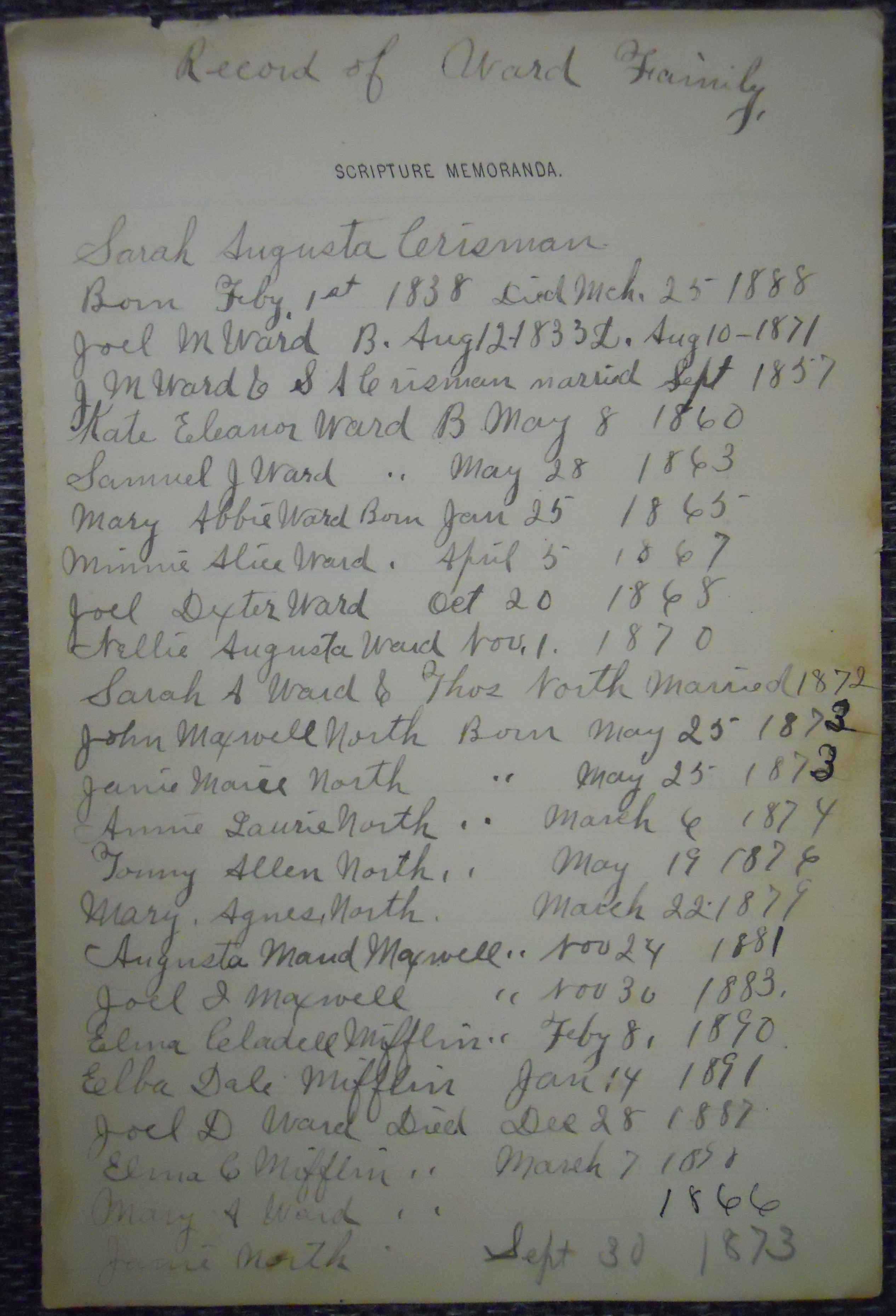 of Joel M. Ward, who married Sarah Augusta Crisman and