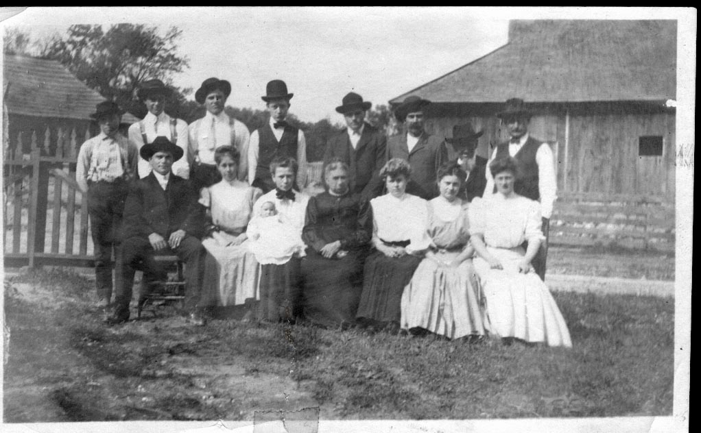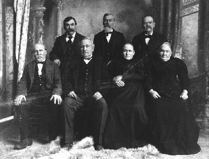The photo with matting is about 10 x 14 inches, and was taken by Hinchey, De Soto Mo 1900. On the back of the photo is written: "Uncle Bat McMullin on left front, My Grandfather John in the middle, Aunt Ann Williams, Aunt Addie Walker, back row Uncle Bill, Uncle Eli Mc, Uncle Walt." Reply to Mary at the De Soto Public Library. (posted prior to March 2005)