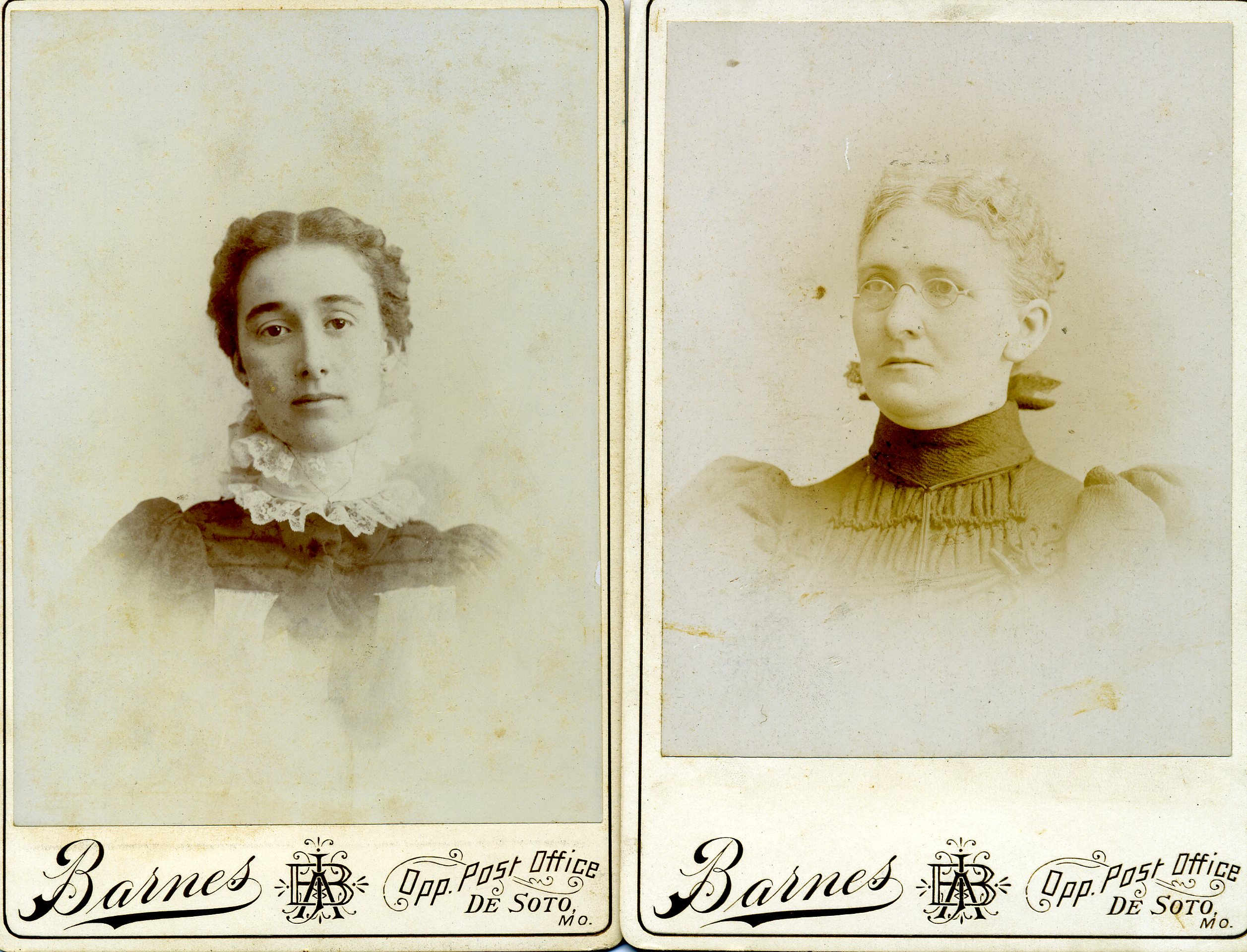 Recently found are two old photographs of women at a garage sale in Benton, Saline Co., Arkansas. It has "Barnes" and "Opp.