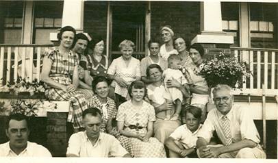 Taken likely around the 1930's, only two people are identified in this photo...the contributor's grandmother Rose Axtetter North nee Dietrich (sitting on the steps holding the baby) and his mother Theresa AXTETTER sitting on the other side of the steps wearing a white scarf around her neck. This picture was taken at Rose's home on Gamel Cemetery Road in Festus. Please contact Larry Hale. (posted 29 August 2005)