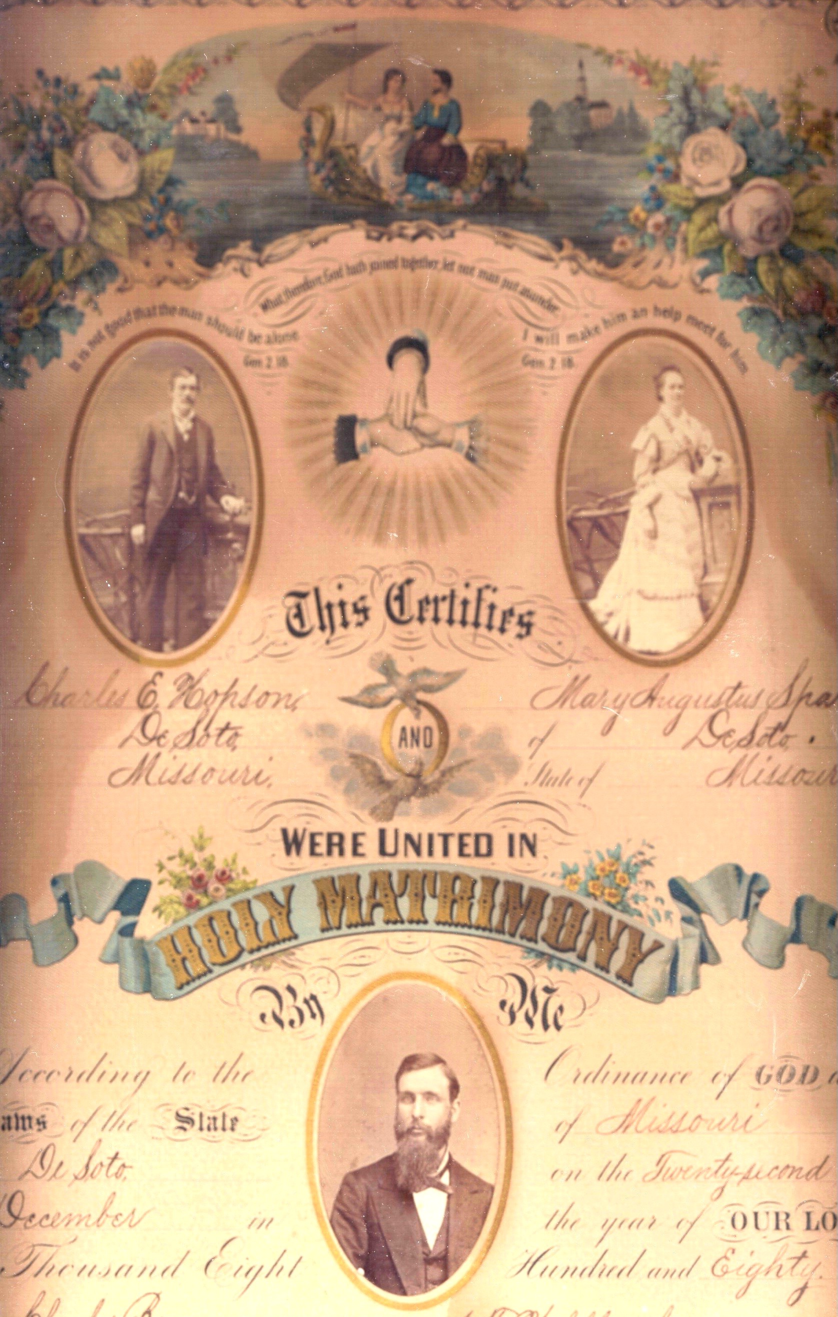 Charles E. Hopson of De Soto, Missouri and Mary Augustus Sparks of De Soto, Missouri, married December 22, 1880. J.F. Wohlfarth, pastor M.E. Church, in De Soto. Witness are Charles Boyne, Jennie Hopson, John Hopson Jr. and Jennie Wright. This picture is in an old frame 17 X 22 inches, given to the library on May 30, 1985, by Hattie Woods Hopson, wife of Howard H. Hopson (son of Charles & Mary), who lived at 322 South Forth (NW corner of Fourth and Pratt Streets) for many years. Howard's sister was Estelle Skinner. Reply to Mary at the De Soto Public Library. (posted prior to March 2005)