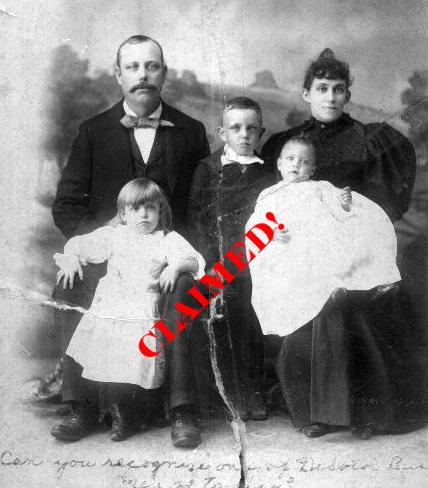 This photo is of a couple and their three children. It is 9 1/2 by 10 inches. On the front is the writing "Can you recognize one of DeSoto's Business men of today?", on the back is "Dad Turner & Mother Jim & Eph taken in Texas 1896." This photo had been torn and been taped back together. Wilma Hill, from De Soto, claimed the picture. The little boy sitting on the woman's lap was her dad - the man and woman in the picture were her grandparents. Congratulations, Wilma!