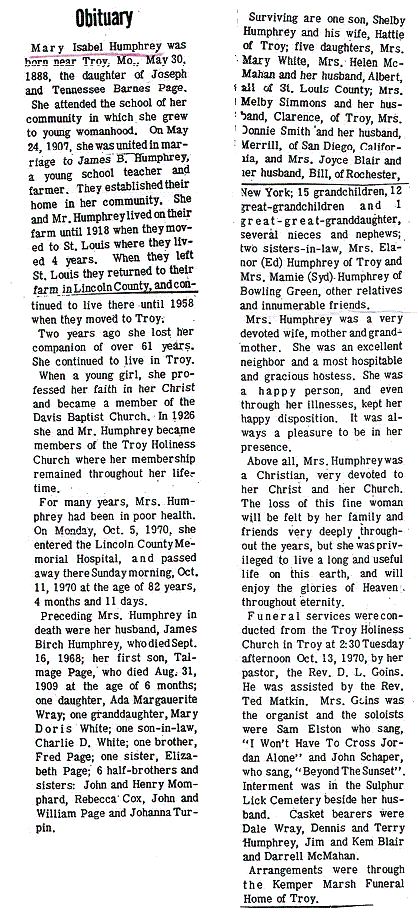 Obituary for Mary Isabel (Page) Humphrey (1888-1970)
