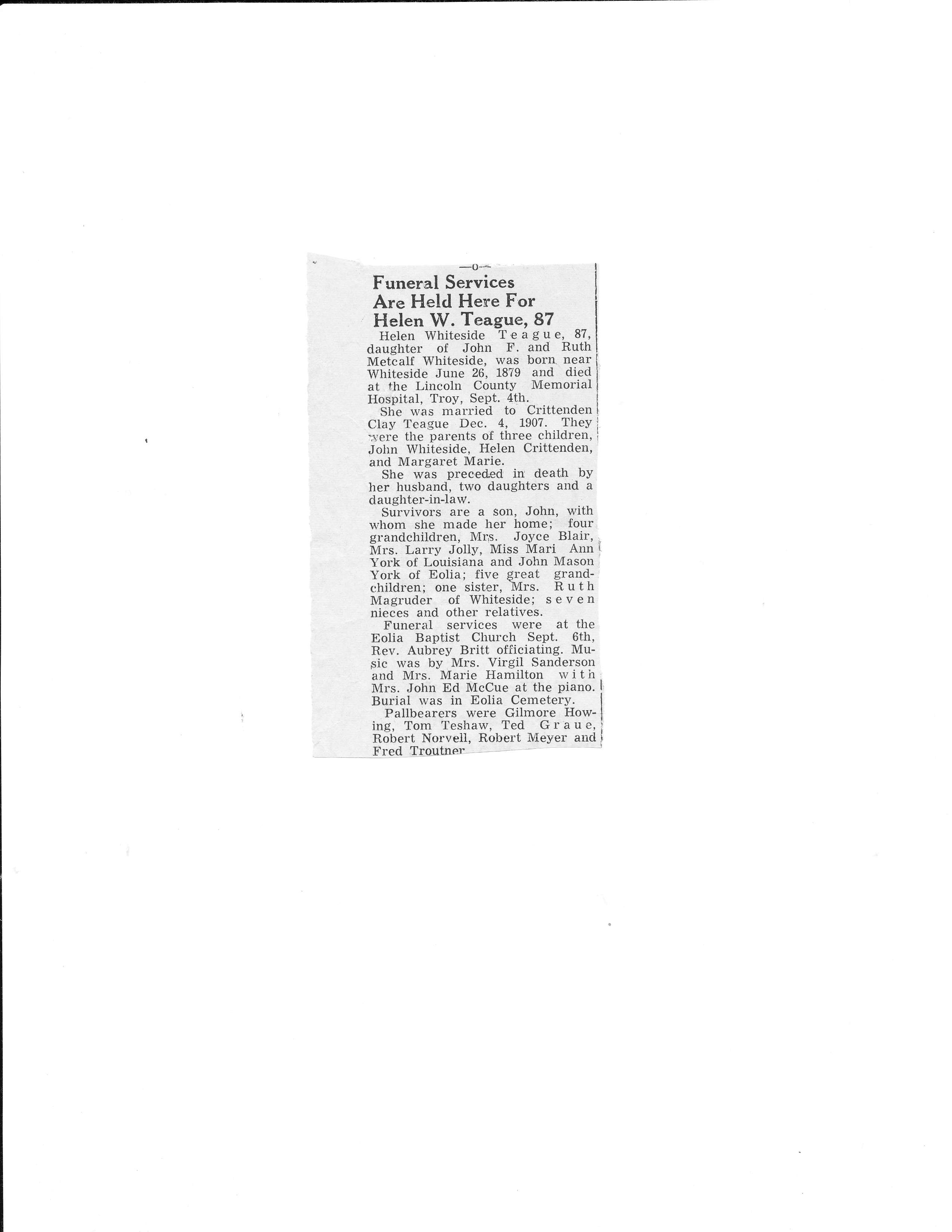 Obituary for Helen Whiteside Teague