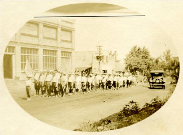 Parade in front of Schulte Shop on North Main St. Notice dirt street