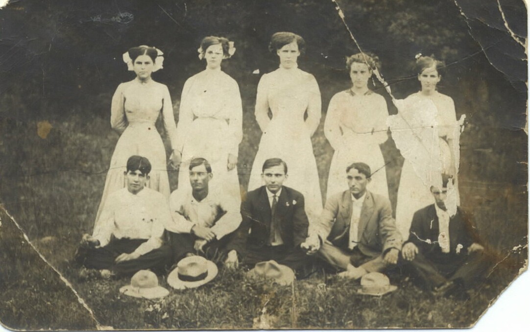 Back: Lizzie Wampler, Nancy Cooper, Edna Combs, Zetta Long, Jane Adams Front: Bill Adams, Lawrence Sprackler, Jim Wright, Arthur Rogers, and Walter Pirtle. Note from Michael: Onion Town as it was called was a part of Mine La Motte in those days, and there was String Town also. I have been told there were rules about living in Onion Town and dating and hanging out with people from String Town, etc. I am not sure about the rules and how closely they were followed, or where the dividing lines between these sections of Mine La Motte were. |