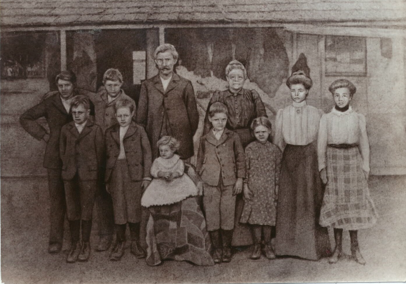 This photo was badly faded and I had to have an artist redraw the people in the photo to scale. I have not been able to find another copy of this picture in my family.
