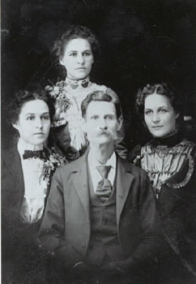 Joshua Newton Shaw & his daughters taken at Fredericktown, MO. 1902. L-R: Jennie Shaw Shetley, Margaret Elizabeth Shaw Walsh, Joshua Newton Shaw, Cordelia E. Shaw Hines.