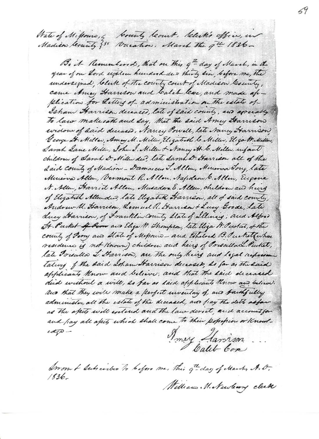 County Court, Clerk’s office, in vacation, Be it Remembered, that on this 9th day of March, in the year of our Lord eighteen hundred and thirty six, before me, the undersigned, Clerk of the county court of Madison County, came Amey Harrison and Caleb Cox, and made application for Letters of Administration on the estate of Isham Harrison deceased, late of said county, and ____ [?] to law make oath and say, that the said Amey Harrison widow of said deceased, Nancy Powell, late Nancy Harrison, George H. Miller, Amey M. Miller, Elizabeth C. Miller, Eliza W. Miller, Sarah Jane Miller, John I. Miller & Nancy C. Miller infant children of Sarah D. Miller decd, late Sarah [referred to as Sally on another document] D. Harrison all of the said County of Madison – Damascus T. Allen, Minerva Long, late Minerva Allen, Vermont R. Allen, Napoleon C. Allen, Eugene N. Allen, Harriet Allen, Musadore E. Allen, children and heirs of Elizabeth Allen decd, late Elizabeth Harrison, all of said county, Andrew M. Harrison, Lemuel R. Harrison and Lucy Goode, late Lucy Harrison, of Franklin County State of Illinois, and Alfred H. Pucket and Eliza W. Thompson, late Eliza W. Pucket, of the county of Perry and State of Missouri – and Ethelred [?] B. Puckett whose residence is not known), children and heirs of Priscilla L. Pucket, late Priscilla L. Harrison, are the only heirs and legal representatives of the said Isham Harrison deceased, so far as the said applicants know and believe; and that the said deceased died without a will, so far as said applicants know and believe. And that they will make a perfect inventory of, and faithfully administer, all the estate of the deceased, and pay the debts as far as the assets will extend and the law direct, and account for and pay all assets which shall come to their possession or knowledge. Amey Harrison Caleb Cox Sworn & Subscribed to before me, this 9th day of March, A.D., 1836.