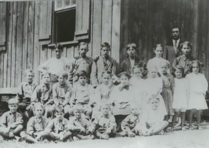 Students in the first row are: Odis, Jeff, Lee & Gertrude Rogers, Major Watts, standing out front is Poley Watts on left.