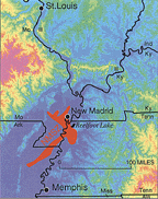 *The third principal shock of the 1811-1812 sequence was January 23, 1812-The first earthquake of this series on December 16, 1811, was located in northeast Arkansas. It is difficult to assign intensities to the principal shocks that occurred after 1811 because many of the published accounts describe the cumulative effects of all the earthquakes. Using the December 16 earthquake as a standard, however, a comparison between it and the shock on January 23 indicates that the intensities were about equal at similar locations. The meizoseismal area was characterized by general ground warping, ejections, fissuring, severe landslides, and caving of stream banks.
