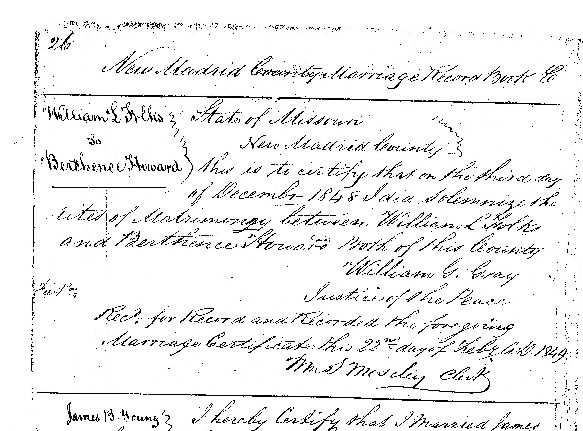 NOTE:William L. Folks and Berthence Howard 3 December 1848 in New Madrid County by William G. Gray, Justice of the Peace Submitted by Cindy Folks Lester
