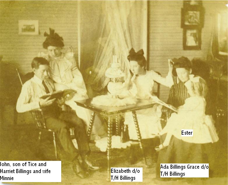 John Billings and his wife Minnie / seated at the table are, Elizabeth Billings and Ada Billings Grace / child unknown. John, Eliz. and Ada were children of Tice Billings and Harriet Bradley