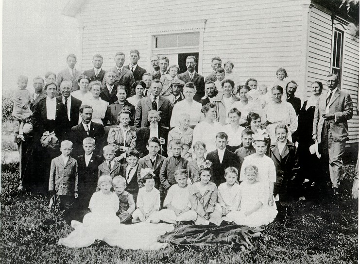 | What: This is the group picture taken in front of the church in Gaynor/Parnell. I made a trip to the area and the church as of that time was still being used. The house across the street from the church was the home of John Munn and Mary Jane Montgomery. In front of the house was a store that I have been told by family members was operated by John Munn. The picture was taken in 1915 on their 60th wedding anniversary. I have a list that I will send later of who most of the people are. The man on the right with a hat in his hand and the older woman I do not know who they are. On the left side there is an older man smiling, again no idea. Mary Jane died in the home in 1924. |