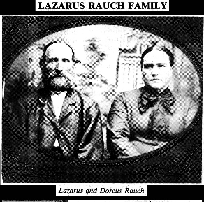 Lazarus Rauch born June 17, 1827, married Dorcus Donaldson, born May 27, 1841, on September 6, 1855, and were parents of eleven children.