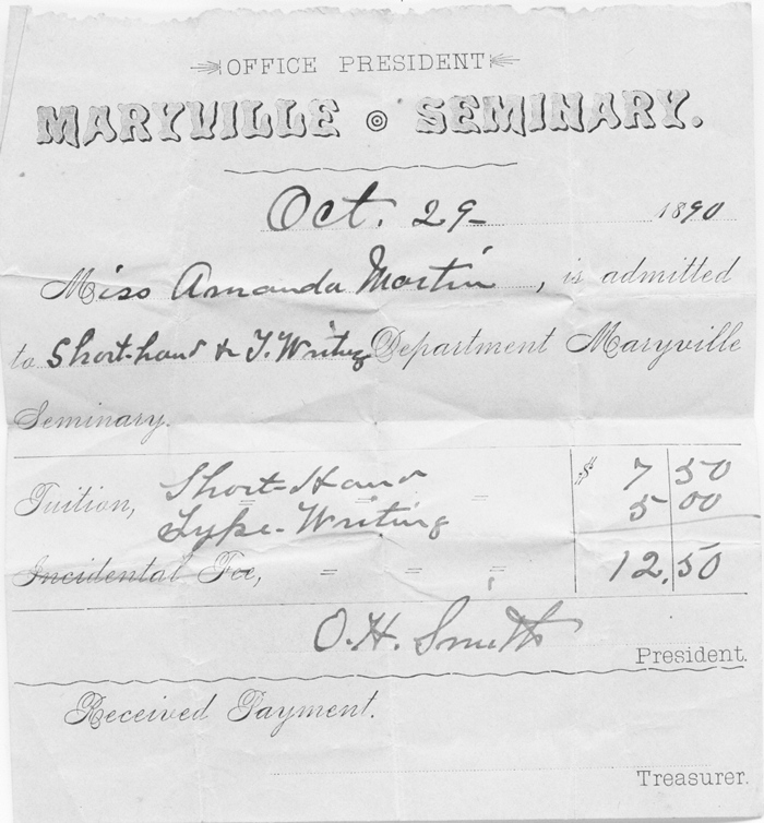 Here is an enrollment receipt for Amanda Martin (ggrandmother) in the Maryville Seminary 1890