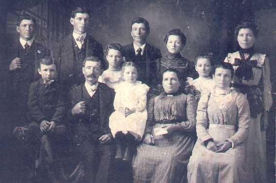 | who: John Stutesman and Mary Jane Chamberlin Family. Back row, left to right: John Junior, Lewis Franklin, Flora Eva, Wilbur Ralph, Lena Pearl, Sylvia Emaline, Iva Jane - front row, left to right: Eugene Ellsworth, John Adam, Mabel, Mary Jane, Carrie Ethel | |