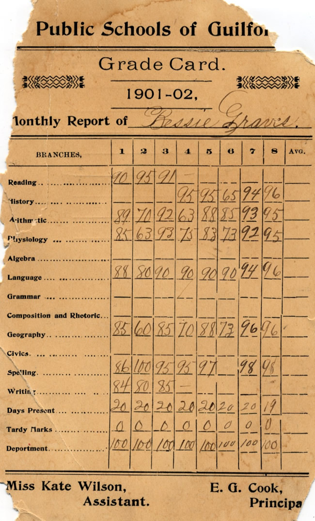 Bessie Graves grade school card from Guilford School, 1901 - 1902