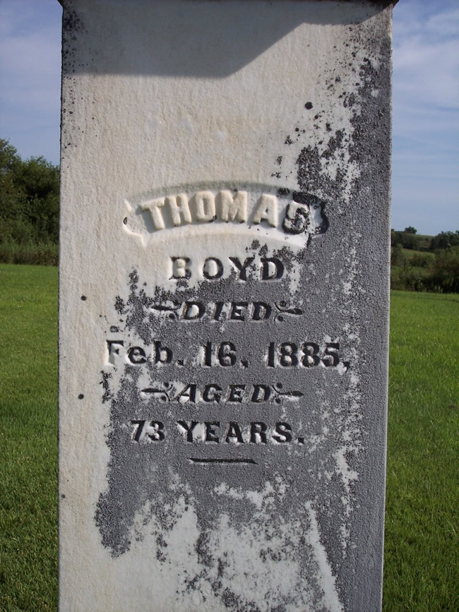 | Boyd, Thomas, died Feb 16, 1885 aged 73y; New Hope Cemetery |