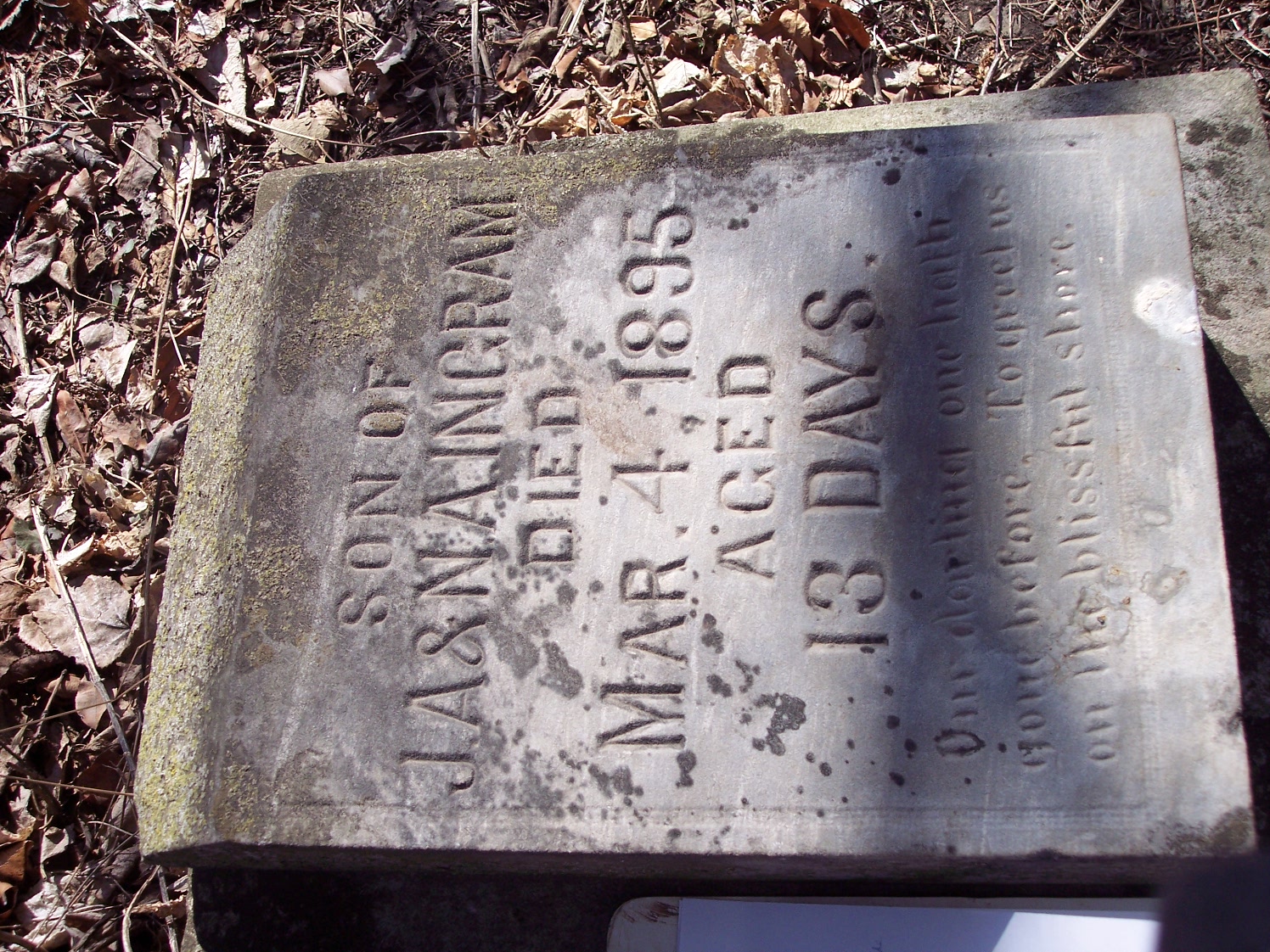 | Ingram, Harley W., son of J.A. & N.A., died Mar 4, 1895 aged 13 days - Cox Cemetery |