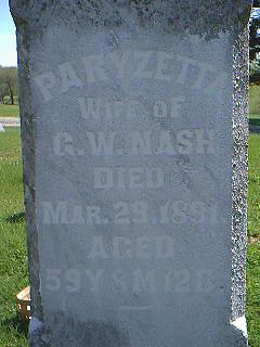 | Nash, Paryzetta Pistole, died 29 Mar 1891 Pick; born 17 Jul 1831 Ky. ND 09 Apr 1891: Paryzetta wife of G.W. Nash, died Mar 29, 1891 aged 59y 8m 12d White Oak Cemetery |