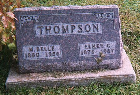 | Elmer Clarence Thompson, son of Ira Graff Thompson and Iowa Alice Warder, was born February 25, 1876 near Glenwood, Schuyler County, Missouri and died January 7, 1967 at St. Francis Hospital, Maryville, Nodaway County, Missouri. He married May Belle Wells December 14, 1899 at her parent's home south of Bedford, Taylor County, Iowa. She was born October 22, 1880 in Douglas County, Illinois and died August 28, 1956 at her home in Bedford, Taylor County, Iowa. |